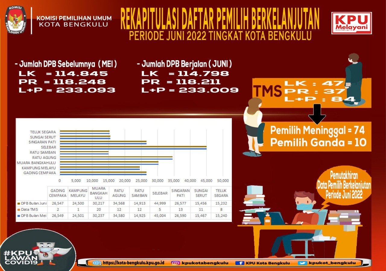 kota-bengkulu.kpu.go.id - KPU Kota Bengkulu melakukan rekapitulasi Daftar Pemilih Berkelanjutan (DPB) Bulan Juni Tahun 2022, berasal dari Berita Acara rapat Pleno Penetapan DPB yang dilakukan oleh KPU Kota Bengkulu untuk Bulan Juni 2022.