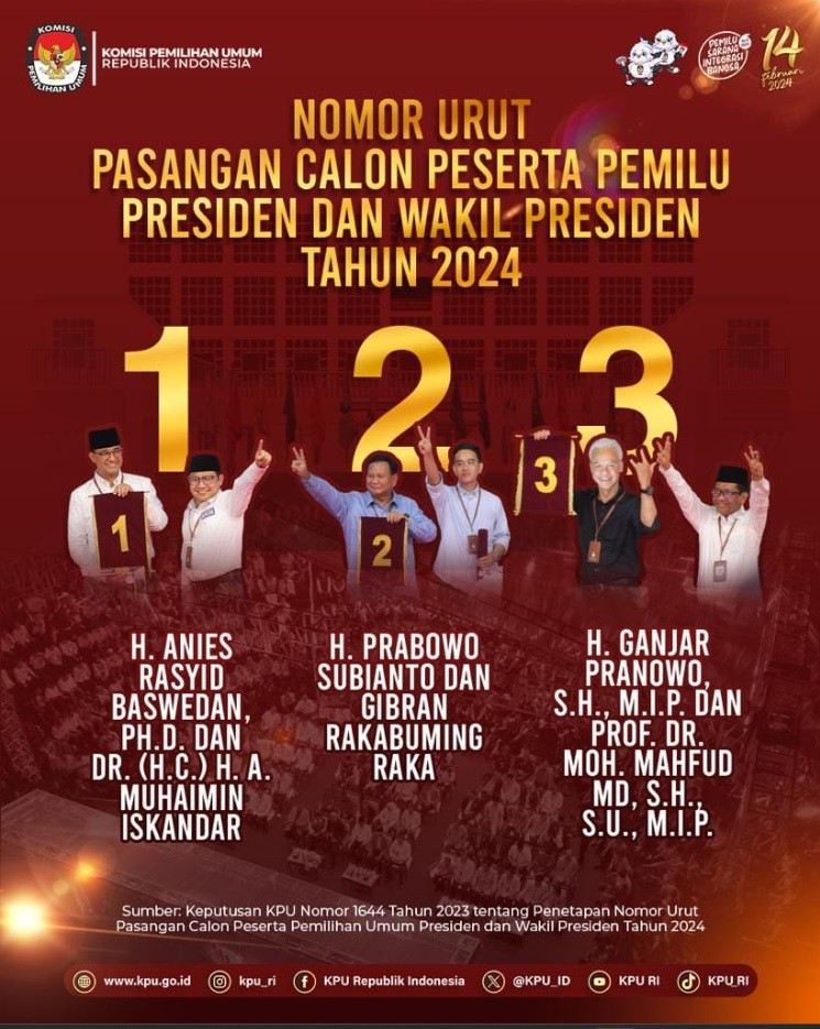 NOMOR URUT PASANGAN CALON PESERTA PEMILU PRESIDEN DAN WAKIL PRESIDEN TAHUN 2024