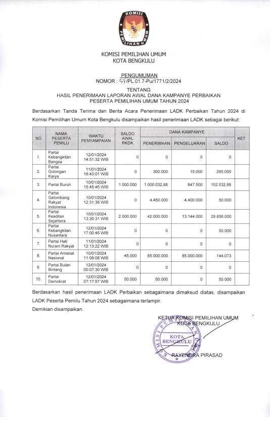 PENGUMUMAN TENTANG HASIL PENERIMAAN LADK PERBAIKAN PESERTA PEMILU TAHUN 2024