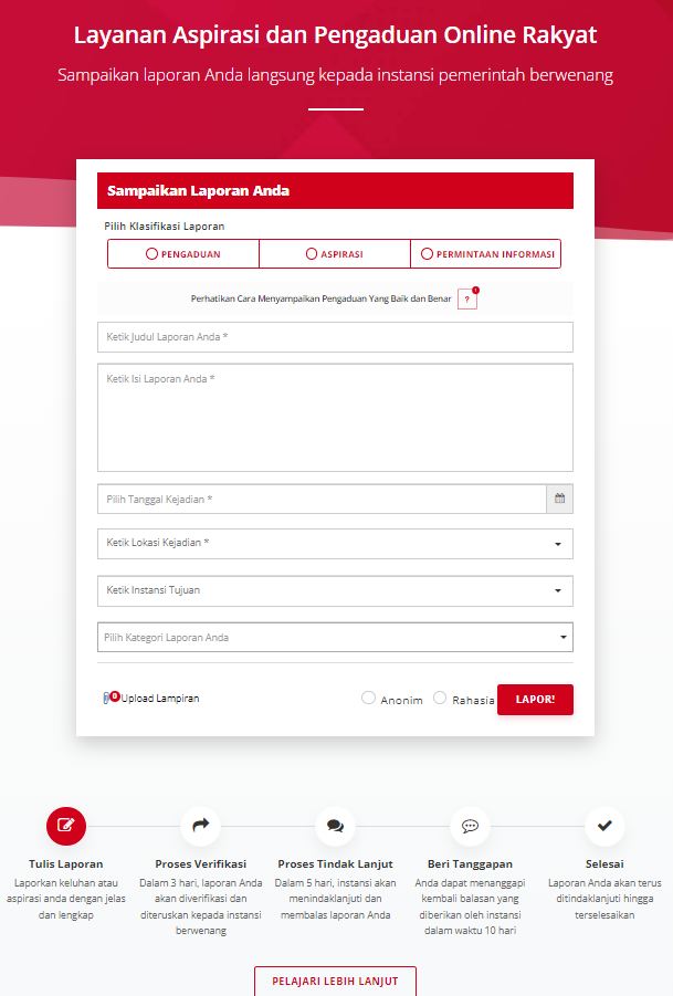 untuk pelaporan pengaduan pelayanan publik, silahkan klik link dibawah ini: