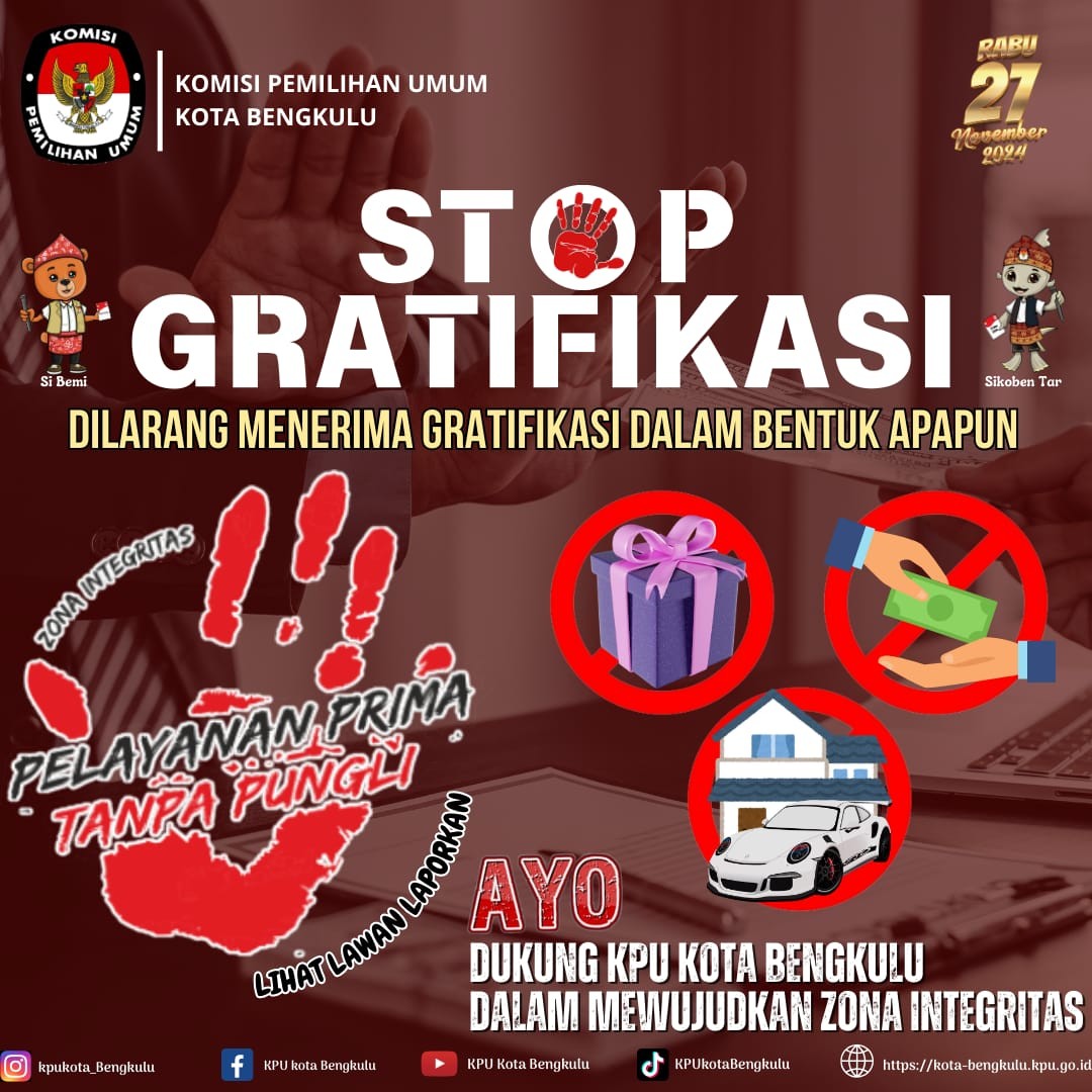 Penetapan satuan kerja wilayah bebas korupsi (WBK) sebagai kompetisi dan menjadi area percontohan penerapan pelaksanaan reformasi birokrasi pada satuan kerja dilingkungan KPU KOTA BENGKULU melalui pembangunan Zona Integritas berdasarkan Peraturan Menteri Pendayagunaan Aparatur Negara dan Reformasi Birokrasi Nomor 52 Tahun 2014 sebagaimana telah di ubah dengan Permenpan RB Nomor 10 Tahun 2019 Tentang Pedoman Pembangungan Zona Integritas di lingkungan Instansi Pemerintah telah menjelaskan bahwa proses pembangunan Zona Integritas memiliki beberapa tahapan yang harus dilalui, yaitu Pencanangan,pembangunan,pengusulan,penilaian,dan penetapan,tujuan utama dalam Pembangunan Zona Integritas Menuju Wilayah Bebas Korupsi Adalah Untuk Pencegahan Korupsi,Kolusi Dan Nepotisme serta Meningkatkan Kualitas Pelayanan Publik.