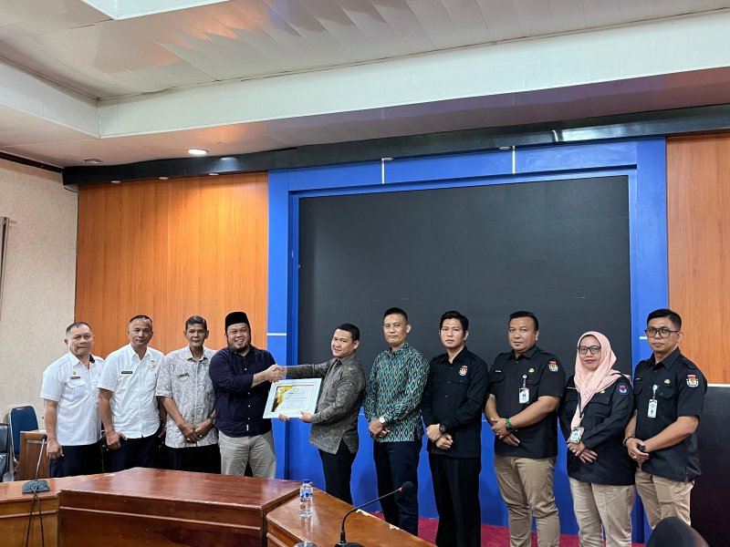 Ketua KPU Kota Bengkulu Rayendra Pirasad Beserta Anggota Komisioner dan di Dampingi Sekretaris Zahyochi,SH.,MH beserta Kasubbag, Menyerahkan Piagam Penghargaan Kepada DPRD Kota Bengkulu Atas Partisipasinya telah Menyukseskan Pemilihan Kepala Daerah di Kota Bengkulu Tahun 2024, Kegiatan ini diterima Langsung Oleh Ketua DPRD Kota Bengkulu Bapak Herimanto, S.Sos.