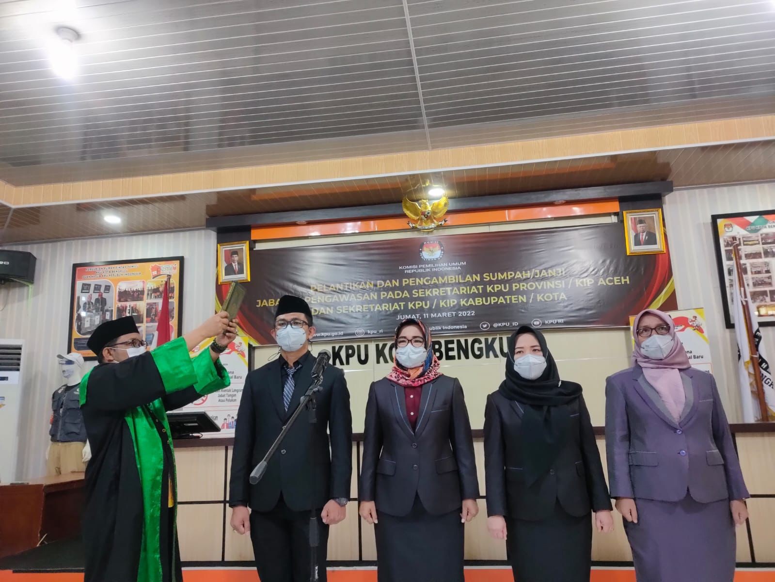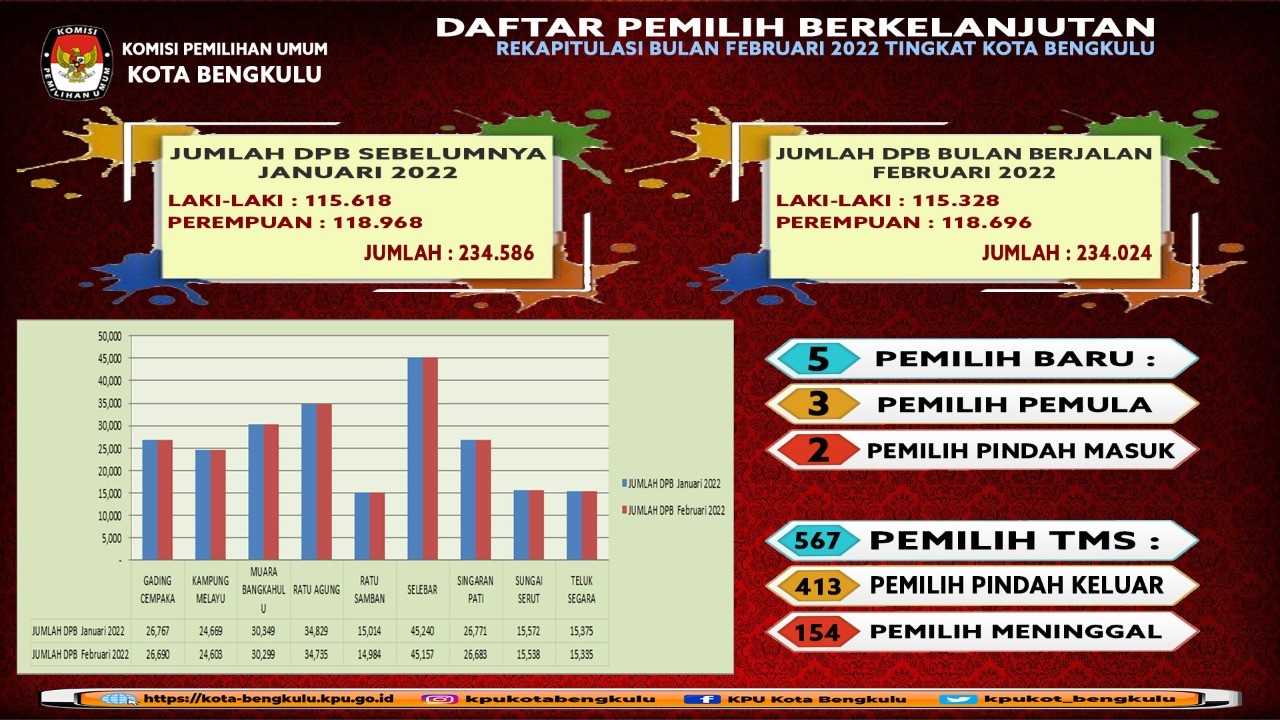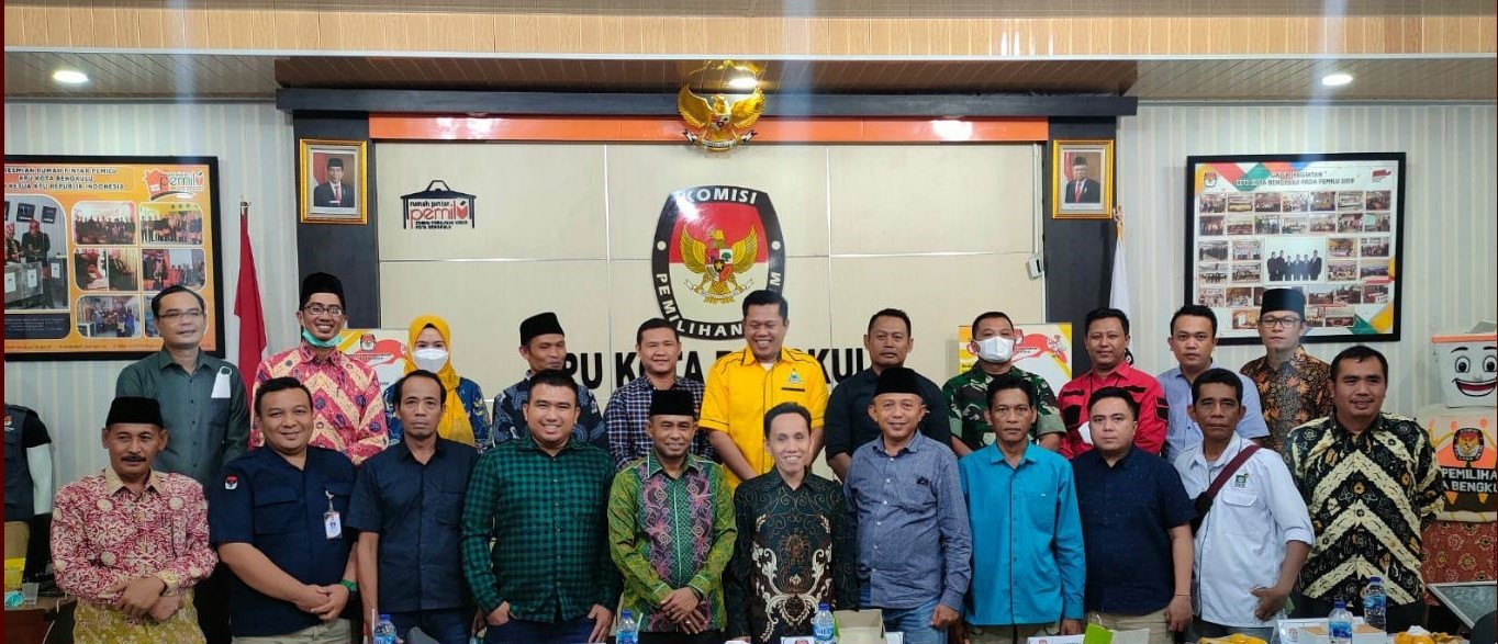 PELUNCURAN TAHAPAN PEMILU 2024 KPU KOTA BENGKULU GELAR NONTON BERSAMA kota-bengkulu.kpu.go.id - Komisi Pemilihan Umum Kota Bengkulu menggelar nonton bareng Peluncuran Tahapan Pemilu 2024 di RPP KPU Kota Bengkulu, Selasa (14/06) malam pukul 19.00 WIB hingga selesai. Kegiatan ini berdasarkan pada Surat ketua KPU RI Nomor 443/PP.06-SD/09/2022 perihal Kegiatan Peluncuran Tahapan Pemilu 2024 tanggal 10 Juni 2022. Diadakannya kegiatan “Nonton Bersama Peluncuran Hari Pemungutan Suara Pemilu Serentak Tahun 2024” melalui Zoom Meeting yang dilaksanakan oleh KPU RI dengan mengundang Forkopimda, Bawaslu Kota Bengkulu dan Pemangku Kepentingan dalam hal ini yang diundang Pengurus Partai Politik Tingkat Kota Bengkulu, diharapkan peserta dapat ikut serta bekerja sama mensosialisasikan Tahapan Pemilu 2024 dan bersama menyukseskan penyelenggaraan Pemilu Serentak Tahun 2024. Kegiatan nonton bersama ini dihadiri oleh Jajaran Forkopimda Kota Bengkulu (Perwakilan Kapolres, Perwakilan Kodim 0407, Perwakilan Walikota Bengkulu), Ketua dan Anggota Bawaslu Kota Bengkulu, Perwakilan Dinas Dukcapil Kota Bengkulu, Pengurus Partai Politik Tingkat Kota Bengkulu, Ketua dan anggota KPU Kota Bengkulu, didampingi Sekretaris KPU Kota Bengkulu, seluruh Kasubbag dan pegawai dilingkungan KPU Kota Bengkulu. Setelah nonton bersama, Ketua KPU Kota Bengkulu memberi kata sambutan kepada undangan yang hadir. “Dengan telah dimulainya Tahapan Pemilu Tahun 2024 pada hari ini maka kami berharap semua pihak terkait dapat bekerja sama dan membantu KPU Kota Bengkulu dalam melaksanakan Tahapan Pemilu 2024” Kata Bapak Martawansyah. Selain itu juga Ketua KPU Kota Bengkulu berpesan pada Pengurus Partai Politik dengan telah ditetapkannya Tahapan Pemilu 2024 untuk itu diminta agar Pengurus Parpol Tingkat Kota Bengkulu mulai mempersiapkan diri berkenaan dengan Tahapan Verifikasi Partai Politik yang hanya dalam hitungan bulan sehingga nantinya tidak mengalami kendala. Kegiatan Nonton Bersama Peluncuran Tahapan Pemilu Serentak Tahun 2024 diakhiri dengan foto bersama seluruh undangan yang hadir.