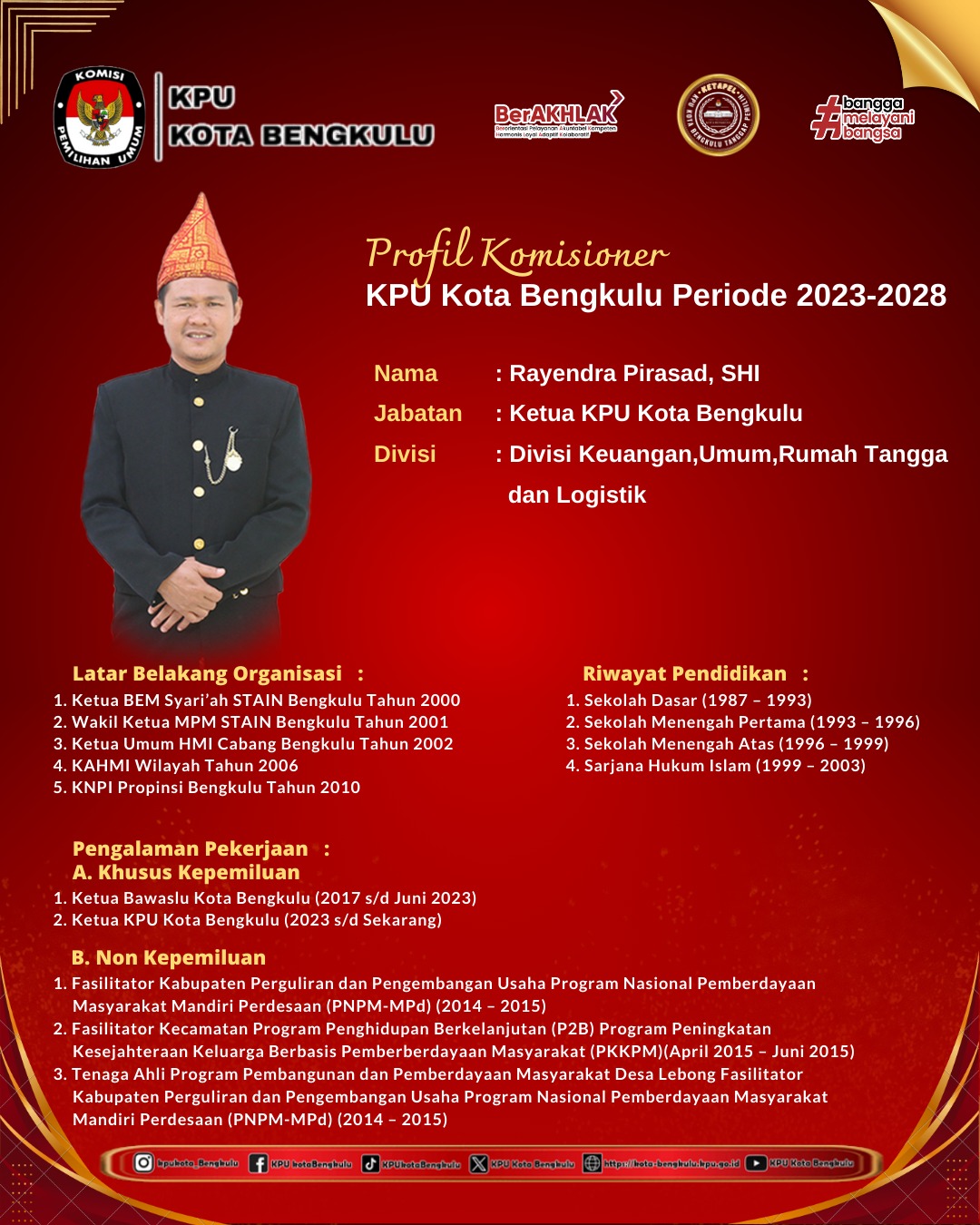 RAYENDRA PIRASAD KETUA KOMISI PEMILIHAN UMUM KOTA BENGKULU DIVISI KEUANGAN,RUMAH TANGGA,UMUM DAN LOGISTIK